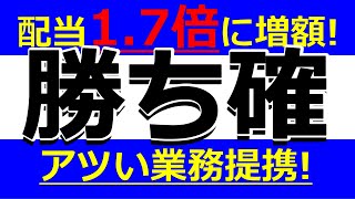 勝ち確!配当1.7倍に増額!アツい業務提携!