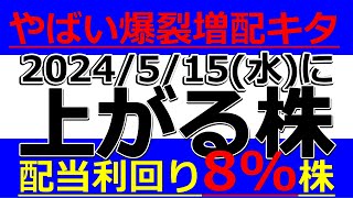 2024/5/15(水)に株価が上がる株、株式投資・デイトレの参考に。やばい爆裂増配キタ!配当利回り8%株