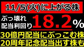 配当利回り18.2%!30億円配当にぶっこむ株!【11/5(火)に株価が上がる株・明日上がる株・株式投資日本株最新情報】