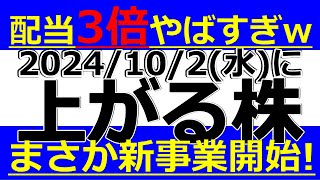 2024/10/2(水)に株価が上がる株、株式投資・デイトレの参考に。配当3倍やばすぎwまさか新事業開始!