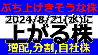 2024/8/21(水)に株価が上がる株、株式投資・デイトレの参考に。ぶち上げきそうな株!増配で配当利回り5%超!株式分割、自社化株買い!