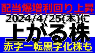 2024/4/24(水)に株価が上がる株、株式投資・デイトレの参考に。配当爆増利回り上昇!赤字一転黒字化株も
