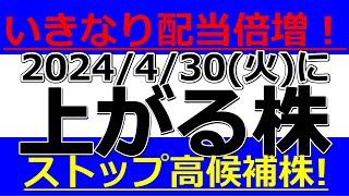 2024/4/30(火)に株価が上がる株、株式投資・デイトレの参考に。いきなり配当倍増!ストップ高候補株!