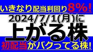 2024/7/1(月)に株価が上がる株、株式投資・デイトレの参考に。いきなり配当利回り8%!初配当がバクってる株!
