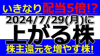 2024/7/29(月)に株価が上がる株、株式投資・デイトレの参考に。いきなり配当5倍になる!?株主還元を増やす株!