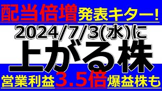 2024/7/3(水)に株価が上がる株、株式投資・デイトレの参考に。配当倍増発表キター!営業利益3.5倍爆益株も!