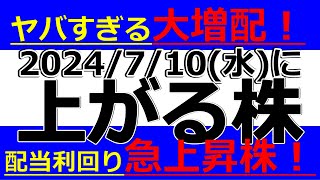 2024/7/10(水)に株価が上がる株、株式投資・デイトレの参考に。ヤバすぎる大増配!配当利回り急上昇株!