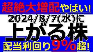 2024/8/7(水)に株価が上がる株、株式投資・デイトレの参考に。超絶大増配やばい!いきなり配当利回り9%超になった株!