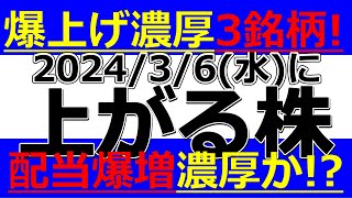 2024/3/6(水) 爆上げ濃厚3銘柄、配当爆増濃厚株出現!?明日株価が上がる株、ストップ高候補株、増配株、株式分割、自社株買いなど。株式投資・デイトレの参考に。