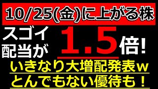 いきなり配当が1.5倍へ!いきなり大増配発表!スゴイ利回りの優待発表した株も【10/25(金)に株価が上がる株・明日上がる株・株式投資日本株最新情報】