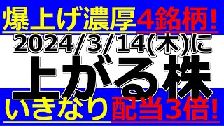 2024/3/14(木) 爆上げ濃厚4銘柄!明日上がる株、ストップ高候補株、増配株、株式分割、自社株買い、株式投資・デイトレの参考に。大増配配当利回り10%超!スペースワン打ち上げ失敗キャノン電子下落