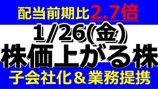 1/26(金) 株価が上がる株。株式投資・デイトレの参考に。配当前期比2.7倍!子会社化&業務提携。未来工業、イボキン、セキド、GFA、ELEMENTS
