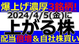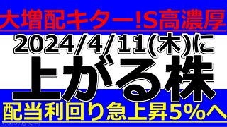 2024/4/11(木)に株価が上がる株、株式投資・デイトレの参考に。大増配キター!ストップ高濃厚!配当利回り急上昇5%へ