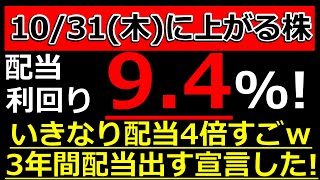 いきなり配当4倍で利回り9.4%エグ過ぎw3年間配当出す宣言した株【10/31(木)に株価が上がる株・明日上がる株・株式投資日本株最新情報】