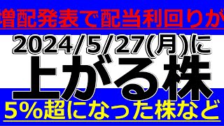 2024/5/27(月)に株価が上がる株、株式投資・デイトレの参考に。増配発表で配当利回りが5%超になった株など