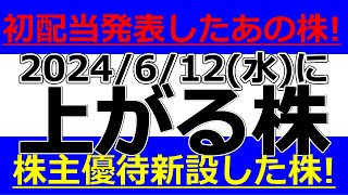 2024/6/12(水)に株価が上がる株、株式投資・デイトレの参考に。初配当発表したあの株!株主優待新設した株!