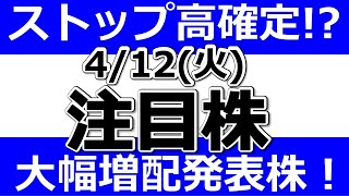 ストップ高確定!?大幅増配発表株!【4月12日(火)の注目銘柄まとめ】本日の株式相場振り返りと明日の注目銘柄・注目株・好材料・サプライズ決算を解説、株式投資の参考に。