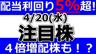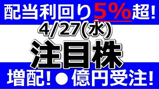 増配で配当利回り5%超へ!〇億円の大型受注も!【4月27日(水)の注目銘柄まとめ】本日の株式相場振り返りと明日の注目銘柄・注目株・好材料・サプライズ決算を解説、株式投資の参考に。