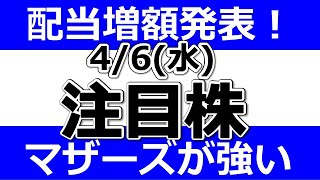 配当増額発表!マザーズも強い【4月6日(水)の注目銘柄まとめ】本日の株式相場振り返りと明日の注目銘柄・注目株・好材料・サプライズ決算を解説、株式投資の参考に。