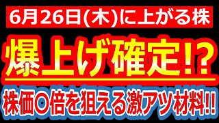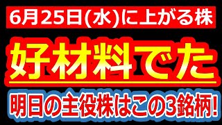 【好材料でた!!明日の主役株はこの3銘柄で決まり!!】6/25(水)に株価が上がる株・来週上がる株・明日上がる株・株式投資日本株最新情報