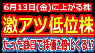 【超速報!!激アツすぎる低位株が出現!!たった数日で株価2倍を狙えるポテンシャルがあります!!】6/13(金)に株価が上がる株・来週上がる株・明日上がる株・株式投資日本株最新情報