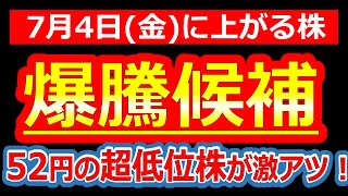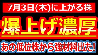【爆上げ濃厚!あの低位株から強材料でた!】7/3(木)に株価が上がる株・来週上がる株・明日上がる株・株式投資日本株最新情報