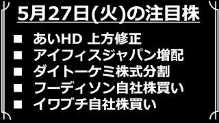 【2025年5月27日(火)の注目株】あいHD 上方修正、アイフィスジャパン増配、ダイトーケミ株式分割、フーディソン、イワブチ自社株買い