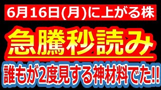【正直、ビビりました!誰もが2度見する神材料でた!!爆騰の序章にすぎない!】6/16(月)に株価が上がる株・来週上がる株・明日上がる株・株式投資日本株最新情報