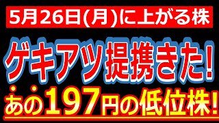【ゲキアツ提携きた!197円の低位株!】5/26(月)に株価が上がる株・来週上がる株・明日上がる株・株式投資日本株最新情報