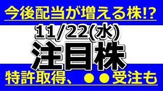 今後配当が増える株!?特許取得、●●受注なども【11月22日(水)の注目株】明日のストップ高候補株・株式投資の参考に