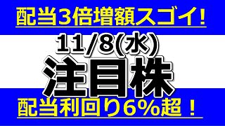 配当3倍増額スゴイ!配当利回り6%超へ!【11月8日(水)の注目株】明日のストップ高候補株・株式投資の参考に