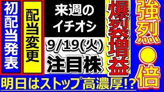 強烈12倍増益!初配当発表株も【9月19日(火)の注目株】明日のストップ高候補株・株式投資の参考に
