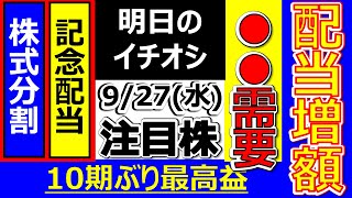 20周年記念配当など【9月27日(水)の注目株】明日のストップ高候補株・株式投資の参考に