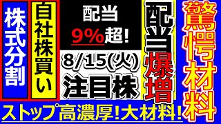 驚愕材料!配当爆増で配当利回り9%超え!【8月15日(火)の注目株】