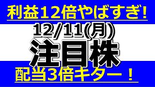 利益12倍やばすぎ!配当3倍キター!【12月11日(月)の注目株】