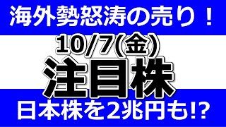 海外勢怒涛の売り!日本株を2兆円も!?【10月7日(金)の注目銘柄まとめ】本日の株式相場振り返りと明日の注目銘柄・注目株・好材料・サプライズ決算を解説、株式投資の参考に