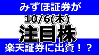 みずほ証券が楽天証券に出資!?【10月6日(木)の注目銘柄まとめ】本日の株式相場振り返りと明日の注目銘柄・注目株・好材料・サプライズ決算を解説、株式投資の参考に