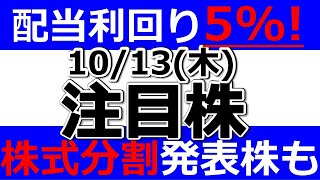 増配発表で配当利回り5%!株式分割発表株も【10月13日(木)の注目銘柄まとめ】本日の株式相場振り返りと明日の注目銘柄・注目株・好材料・サプライズ決算を解説、株式投資の参考に