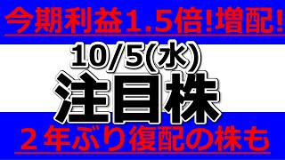 今期利益1.5倍で増配も!2年ぶり復配の株も!【10月5日(水)の注目銘柄まとめ】本日の株式相場振り返りと明日の注目銘柄・注目株・好材料・サプライズ決算を解説、株式投資の参考に