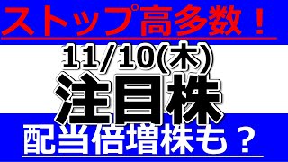 ストップ高多数!配当倍増株も?【11月10日(木)の注目銘柄まとめ】本日の株式相場振り返りと明日の注目銘柄・注目株・好材料・サプライズ決算を解説、株式投資の参考に
