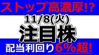 ストップ高濃厚!?配当利回り6%超!【11月8日(火)の注目銘柄まとめ】本日の株式相場振り返りと明日の注目銘柄・注目株・好材料・サプライズ決算を解説、株式投資の参考に