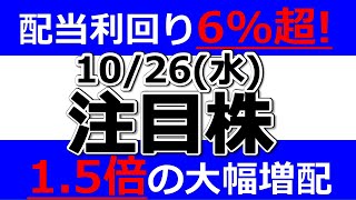 配当利回り6%超!1.5倍の大幅増配!【10月26日(水)の注目銘柄まとめ】本日の株式相場振り返りと明日の注目銘柄・注目株・好材料・サプライズ決算を解説、株式投資の参考に
