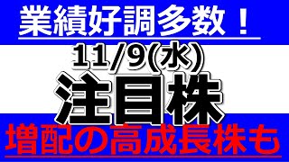 業績好調多数!増配の高成長株も【11月9日(水)の注目銘柄まとめ】本日の株式相場振り返りと明日の注目銘柄・注目株・好材料・サプライズ決算を解説、株式投資の参考に