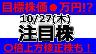 目標株価●万円!?〇倍上方修正株も!【10月27日(木)の注目銘柄まとめ】本日の株式相場振り返りと明日の注目銘柄・注目株・好材料・サプライズ決算を解説、株式投資の参考に