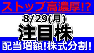 ストップ高濃厚!?配当増額!株式分割!【8月29日(月)の注目銘柄まとめ】本日の株式相場振り返りと明日の注目銘柄・注目株・好材料・サプライズ決算を解説、株式投資の参考に