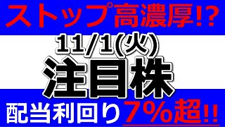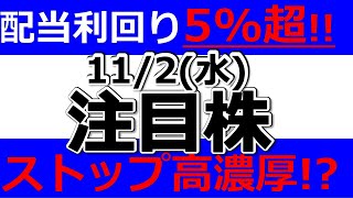 配当利回り5%超!!ストップ高濃厚!?【11月2日(水)の注目銘柄まとめ】本日の株式相場振り返りと明日の注目銘柄・注目株・好材料・サプライズ決算を解説、株式投資の参考に