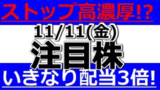 ストップ高濃厚!?配当3倍株出現!配当利回り5%超!【11月11日(金)の注目銘柄まとめ】本日の株式相場振り返りと明日の注目銘柄・注目株・好材料・サプライズ決算を解説、株式投資の参考に