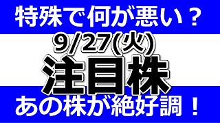 特殊で何が悪い?あの株が絶好調!【9月27日(火)の注目銘柄まとめ】本日の株式相場振り返りと明日の注目銘柄・注目株・好材料・サプライズ決算を解説、株式投資の参考に
