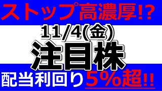 ストップ高濃厚!?配当利回り5%超!!【11月4日(金)の注目銘柄まとめ】本日の株式相場振り返りと明日の注目銘柄・注目株・好材料・サプライズ決算を解説、株式投資の参考に
