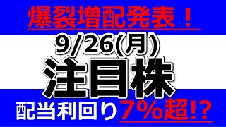 あの株が爆裂増配で配当利回り7%超へ!【9月26日(月)の注目銘柄まとめ】本日の株式相場振り返りと明日の注目銘柄・注目株・好材料・サプライズ決算を解説、株式投資の参考に